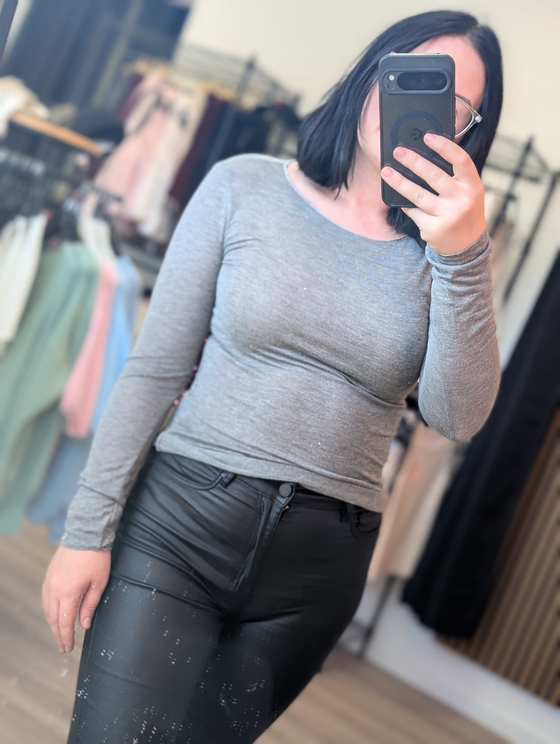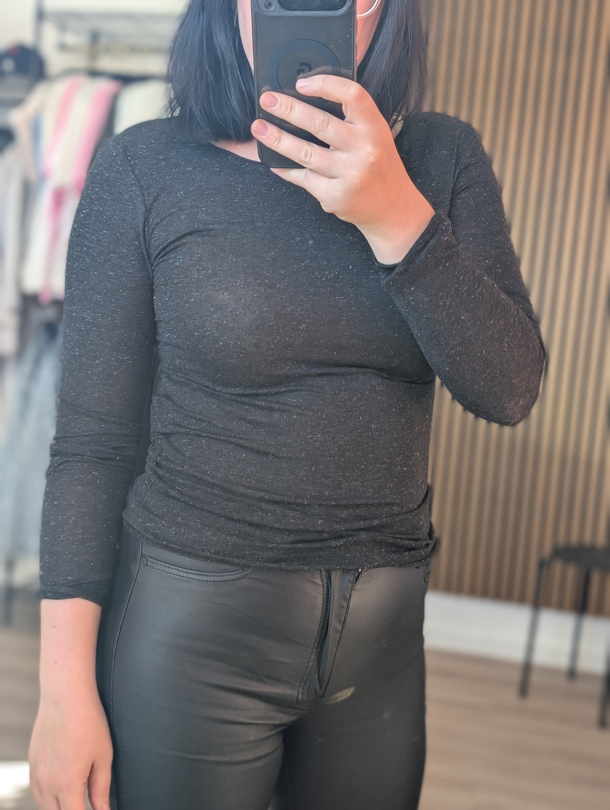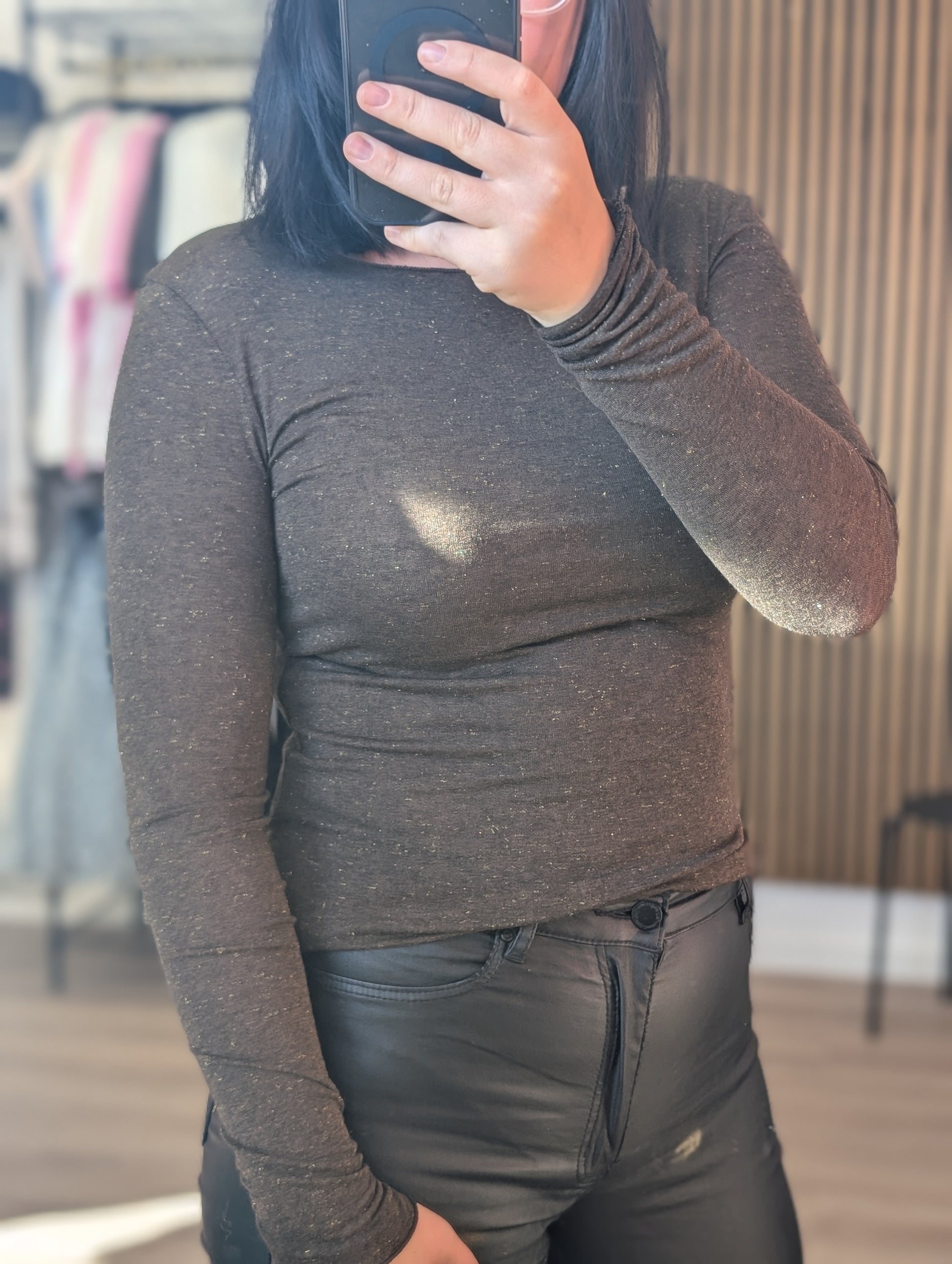 Dieses hochwertige Basic-Oberteil fühlt sich unglaublich weich und leicht auf der Haut an. Die feinen Glitzerfäden, die dezent in das Material eingewebt sind, sorgen für einen edlen, nicht aufdringlichen Schimmer, der unter jedem Blazer oder offen getragenen Cardigan hervorblitzt.